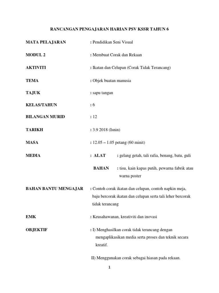 RANCANGAN PENGAJARAN HARIAN PENDIDIKAN SENI VISUAL TAHUN 4 Tarikh Masa Kelas 4 Bidang Membuat Corak dan Rekaan Tema Objek Buatan Manusia Tajuk Sapu Tangan Akti. Penggunaan alat dan bahan yang sesuai diperlukan dalam proses penghasilan karya Membentuk dan Membuat Binaan. Kain sebaiknya kain kapas yang telah dibersih dan dikeringkan 2.